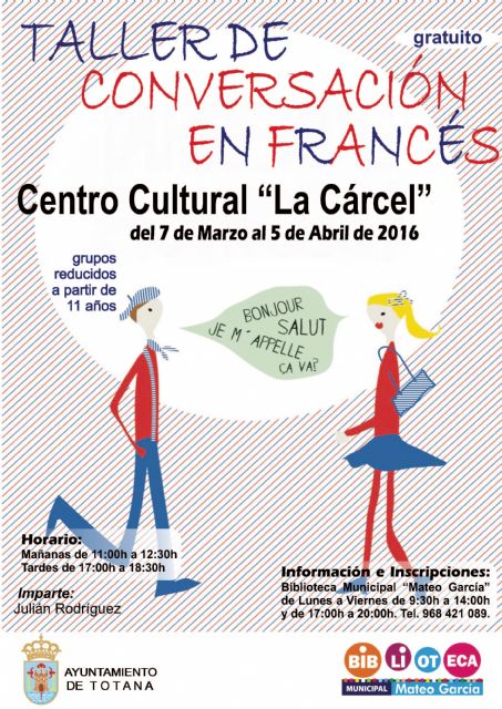 La Concejalía de Cultura, a través de la biblioteca municipal "Mateo García", ha organizado un taller de conversación en francés para niños y jóvenes de 11 años en adelante, y que tendrá una duración de un mes. El taller será impartido gratuitamente por Julián Rodríguez, colaborador de la biblioteca.