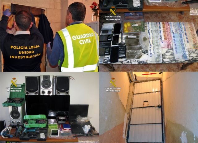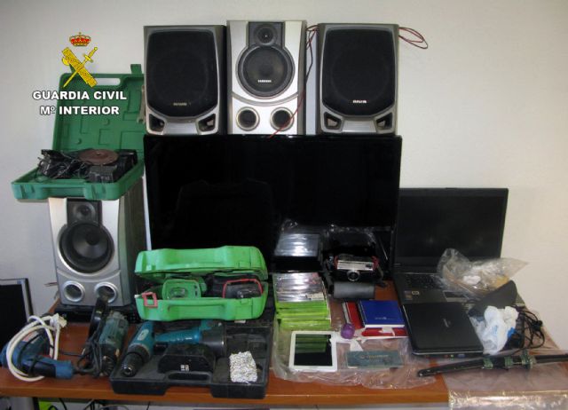 Además de la droga y los útiles relacionados con ésta, los investigadores hallaron en el interior de la vivienda numerosos objetos de supuesta procedencia ilícita, como ordenadores portátiles (2), varios teléfonos móviles, taladros (5), una tableta, equipos de sonido, un televisor, un disco duro multimedia, un arma blanca modificada, una cámara fotográfica, complementos y material audiovisual entre otros, al parecer adquiridos por los ahora arrestados a cambio de la droga distribuida, que procedían de asaltos en viviendas de Totana y Mazarrón, y su fin era la comercialización en el mercado ilícito.
