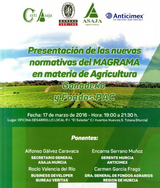 La organización agraria "ASAJA Región de Murcia" organiza el próximo 17 de marzo, de 19:00 a 21:30 horas, una conferencia sobre las nuevas normativas del Ministerio de Agricultura, Alimentación y Medio Ambiente en materia agrícola y ganadera, así como con los fondos de la Política Agraria Común (PAC).