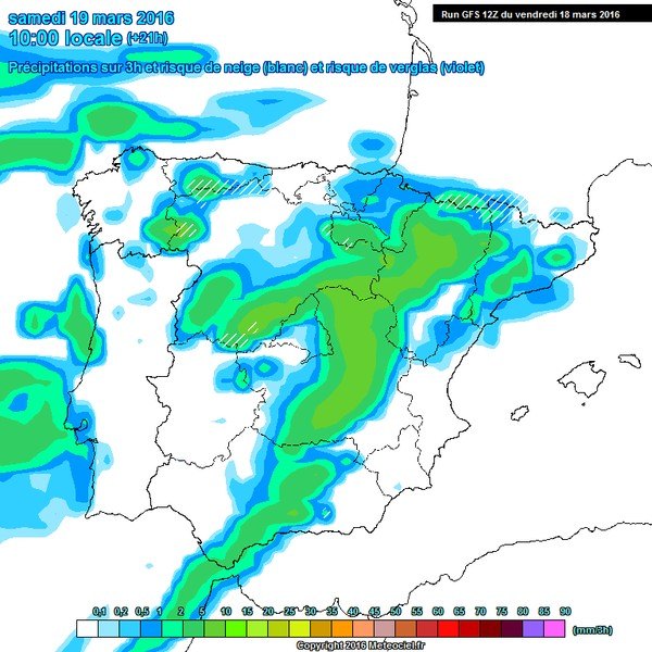 Mapa con la predicción para el sábado a las 10 de la mañana en el que se observa el frente a las puertas de la Región de Murcia. Consulte la leyenda de colores que indican la cantidad de precipitaciones estimada