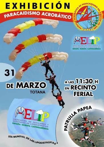 La Patrulla Acrobática de Paracaidismo del Ejército del Aire (PAPEA) ofrecerá una exhibición de paracaidismo acrobático mañana 31 de marzo en Totana con motivo del Día Mundial de las Lipodistrofias.