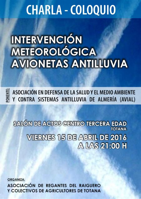 La Concejalía de Participación Ciudadana informa de que el viernes, día 15 de abril, a partir de las 21:00 horas, se celebrará en el salón de actos del Centro Municipal de la Tercera Edad, de la plaza Balsa Vieja, una charla-coloquio sobre la "Intervención meteorológica de las avionetas antilluvia".