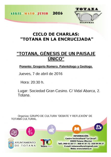 La Concejalía de Cultura inaugura mañana, dentro del programa "Totana Cultural", el ciclo de charlas "Totana en la encrucijada", que abre el geólogo totanero Gregorio Romero con la conferencia "Totana, génesis de un paisaje único".