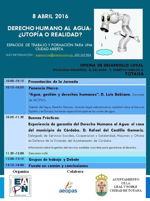 Con el título “Derecho Humano al Agua ¿Utopia o Realidad?”, EAPN-RM ha organizado esta jornada teniendo como colaboradores al Ayuntamiento de Totana y a la Asociación Española de Operadores Públicos de Abastecimiento y Saneamiento (AEOPAS).