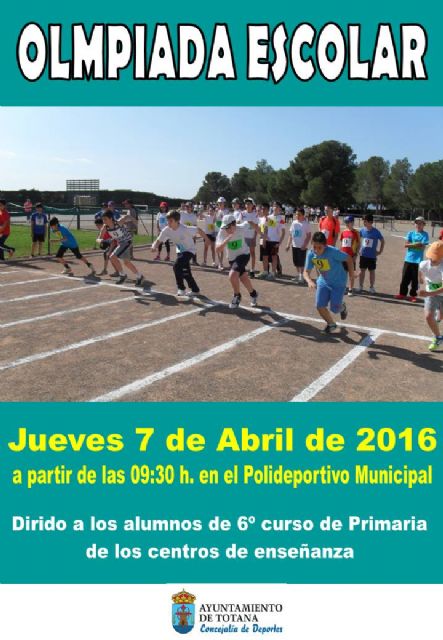 La Concejalía de Deportes tiene previsto organizará mañana, jueves 7 de abril, una Olimpiada Escolar en el Polideportivo Municipal "6 de diciembre" entre las 09:30 y 13:00 horas, en colaboración con los centros de enseñanza de la localidad, donde participarán los alumnos de 6° curso de primaria.