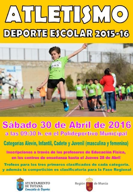 La Concejalía de Deportes organiza el próximo sábado 30 de abril en el Polideportivo Municipal "6 de diciembre" la Fase Local de Atletismo de Deporte Escolar, a partir de las 9:30 horas de la mañana, donde participarán alumnos de todos los centros de enseñanza de la localidad, pertenecientes a las categorías alevín, infantil, cadete y juvenil, tanto en modalidad masculina como femenina.