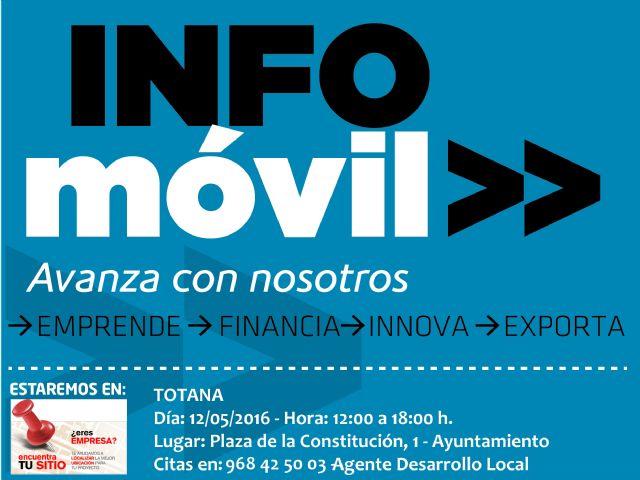 La oficina "INFOmóvil" visitará la plaza de la Constitución de Totana el próximo jueves, día 12 de mayo, por la tarde con el fin de dar a conocer los servicios disponibles a emprendedores y empresarios de este municipio, según informan la Concejalía de Atención al Ciudadano.