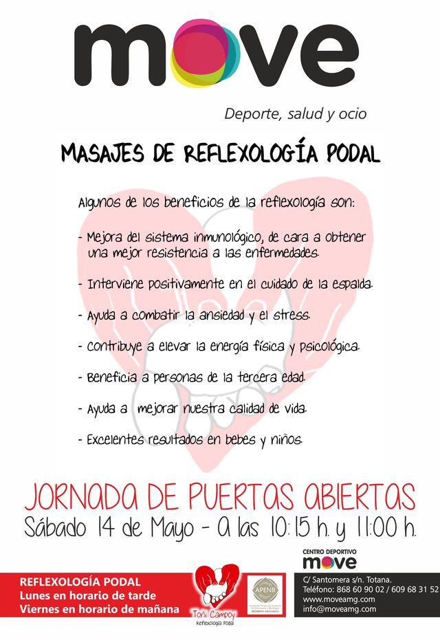 Totana Noticias El Centro deportivo MOVE acoge un taller de Risioterapia 12/05/2016 El Centro deportivo MOVE acoge un taller de Risioterapia Y una jornada de puertas abiertas "masajes de reflexologĂa podal" Fuente: MOVE