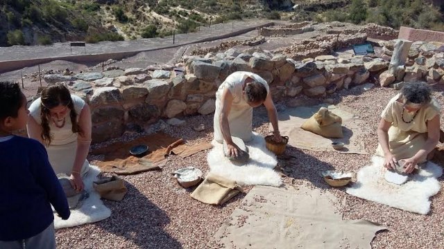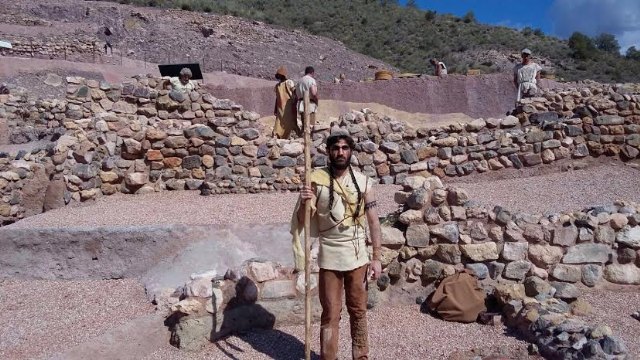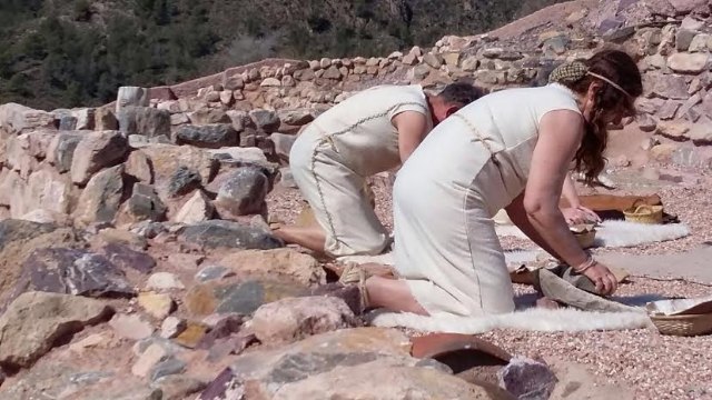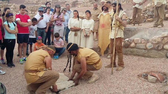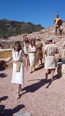Más de 20 actores recrearon escenas de la vida en La Bastida hace 4.200 años; y en las mismas protagonizan un taller de molienda, trabajos en la carnicería, almacén, solemne ritual funerario y otras puestas en escena que captaron al visitante desde el primer momento.
