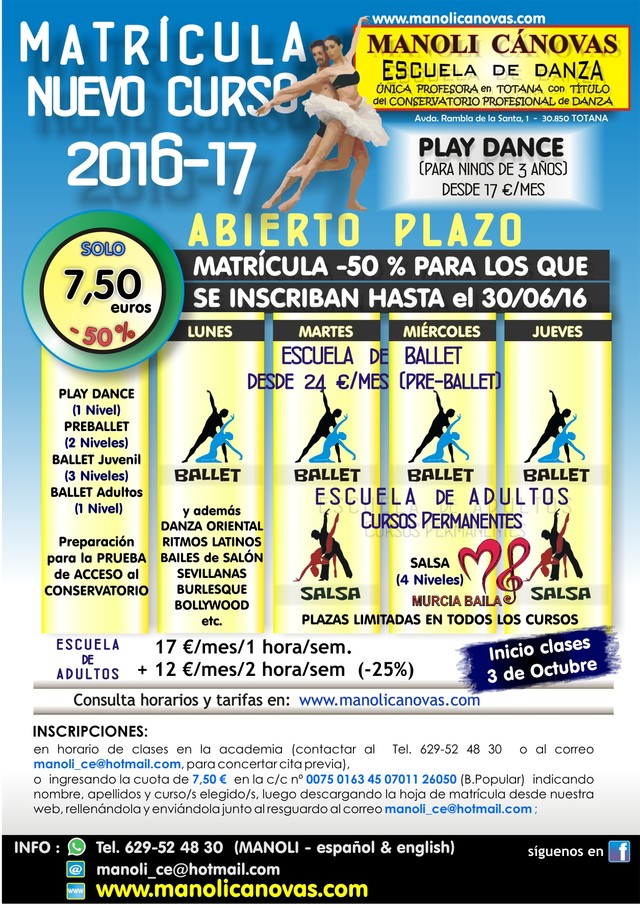 Recordamos que el período de inscripción con el 50% de descuento será desde el 1 hasta el 30 de Junio ambos inclusive. Para consulta de horarios y otro tipo de información se puede acudir a la página www.manolicanovas.com y en Facebook en Escuela de Danza Manoli Cánovas.