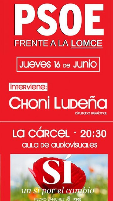En dicha jornada, intervendrá Choni Ludeña, diputada en la Asamblea Regional por el Partido Socialista y abordará temas relacionados con la LOMCE, los recortes que se están llevando a cabo en educación, así como las propuestas del Partido Socialista en materia de educación, entre otras cuestiones relacionadas con el sector educativo.