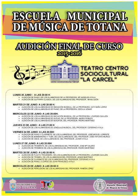 La Escuela Municipal de Música de Totana ha organizado un total de dieciocho audiciones entre los días 20 y 29 de junio en el teatro del Centro Sociocultural "La Cárcel" con motivo del final de curso 2015/2016, según informan fuentes de la Concejalía de Cultura.