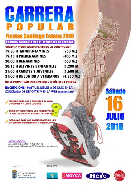 La Carrera Popular "Fiestas de Santiago" de Totana, organizada por la Concejalía de Deportes, tendrá lugar el próximo sábado 16 de julio, con salida y meta en la plaza de la Constitución de esta localidad; y este año cuenta con un componente solidario dado que se organiza a beneficio de los damnificados del terremoto de Ecuador.