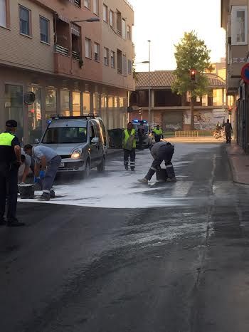 Los operarios de la brigada de limpieza han vertido grandes cantidades de serrín y yeso para que se absorbiera el combustible desde la rotonda del "Donante de Sangre" hasta la denominada "Alfonso Navarro, junto al Pabellón de Deprotes; y así proceder a su progresiva retirada de la calzada.