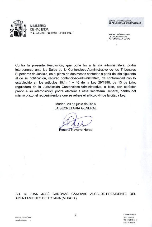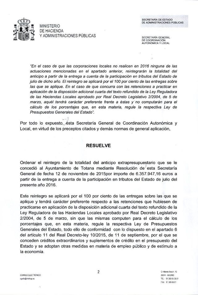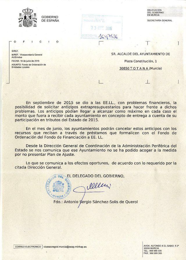 Esta negativa de la mayoría del pleno a la aprobación del Plan de Ajuste consensuado y presentado por el Alcalde, ha significado la llegada de un escrito del delegado de gobierno, en el que se comunica la imposibilidad de acogernos a nuevos planes de ayudas, así como la retención de los pocos tributos del estado que se hacían efectivos al consistorio y la devolución del total de las ayudas a las que se acogió este ayuntamiento.