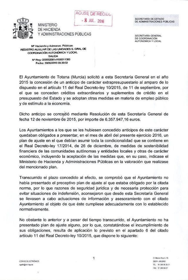 Según informan desde Ganar Totana IU, "tal y como advertíamos en su momento, la no aprobación y presentación de un Plan de Ajuste en el Ministerio de Hacienda, supondría agravar la ya precaria situación económica del ayuntamiento de Totana". En dos ocasiones, los votos en contra de PP y PSOE, impidieron la formalización de un compromiso que se adquirió con dicho ministerio cuando el consistorio se acogió a unos planes de ayudas para dar un poco de oxígeno y solventar deudas con bancos y pequeñas empresas contraídas por el Partido Popular.