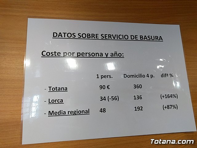 El Presidente de CEBAG debería revisar los recibos en los que se refleja la tasa exacta que se paga por la recogida de la basura en Totana, en lugar de dar unas cifras falsas y desorbitadas escudándose en un supuesto informe de la Universidad de Murcia. Demuestra un gran desconocimiento cuando se da por veraz cualquier informe externo, cuando simplemente con un recibo al alcance de cualquier vecino se puede comprobar fácilmente que esas cifras son incorrectas. Una familia de hasta 5 miembros, paga en Totana un total de 110€ anuales en concepto de recogida de residuos, muy lejos de los 360 que él afirma.