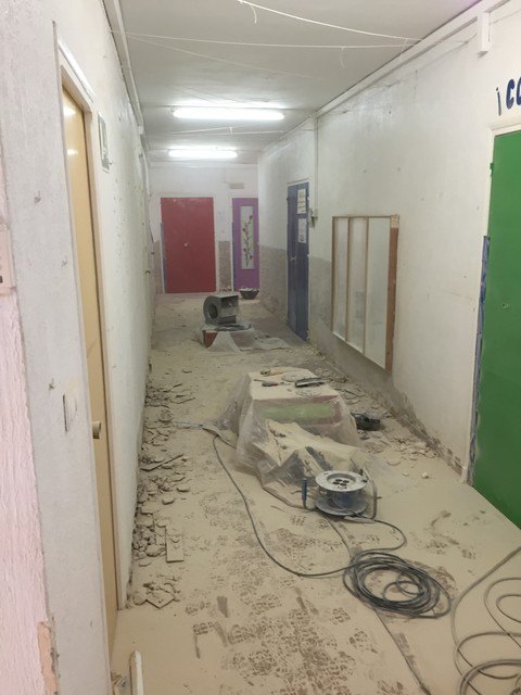 Los trabajos que se están realizando por parte de la empresa Hermanos Palomares, consisten en levantado de rodapiés, saneamientos de las humedades existentes en este edificio y colocación de zócalo una vez realizado el saneamiento. Así mismo, desde la Concejalía de Servicios informan que es necesario cuando las condiciones económicas lo permitan o bien por medio de una subvención la construcción de una nueva guardería municipal, en la actual ubicación de la escuela infantil “Clara campoamor”.