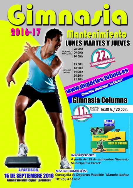 La Concejalía de Deportes tiene previsto comenzar el día 15 de septiembre, el programa municipal de "Gimnasia de Mantenimiento 2016/17" en las instalaciones municipales del Gimnasio "La Cárcel".
