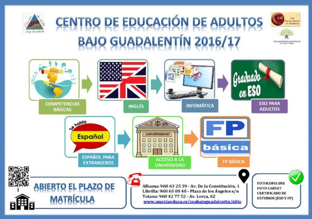 La Concejalía de Educación recuerda que continúa abierto el plazo de matrícula de la nueva oferta formativa del Centro de Educación de Adultos "Bajo Guadalentín" de Totana para el próximo curso 2016/2017, que aglutina un amplio abanico de las denominadas enseñanzas formales y no formales.