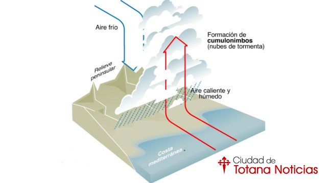 Para potenciar aún más el efecto ascendente del aire húmedo, en España hay muchas montañas costeras, el conocido pre-litoral. Contra ellas choca el aire húmedo del mar,favoreciendo aún más su ascensoy potenciando su efecto devastador.