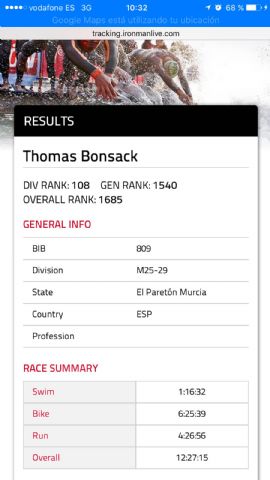 Este Domingo día 02 de Octubre se celebró el IRONMAN DE BARCELONA la prueba más dura dentro del triatlon que consta de 3.800 de nado, 180 km de bicicleta y 42,195 m de carrera, en la prueba participó uno de los miembros de nuestro club, Thomas Bonsack, ni que decir tiene que desde el club tenemos que enviarle nuestra felicitación por solamente haber finalizado la prueba, decir que Thomas es el primer año que hacía Triatlon y que después de comenzar la temporada participando en un MEDIO IRONMAN como el de SEVILLA, y de participar en algunos de distancia sprint y olimpica, se enfrentaba al reto más importante del año y el que tenía marcado desde el principio, y que lo ha conseguido con un muy buen tiempo, logrando finalizarlo con 12 horas y 26 minutos, que para ser una primera participación es una buena marca.