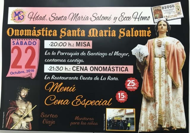La Hermandad de Santa María Salomé de Totana celebrará un año más una misa en honor a Santa María Salomé, que tendrá lugar a las 20:00 horas en la Parroquia de Santiago de Totana