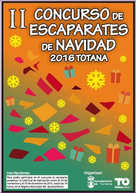 Las Concejalías de Festejos y Cultura mantiene abierto hasta mañana, día 15 de diciembre, el plazo para inscribirse en el II Concurso de Escaparates de Navidad "Totana´2016, que organizan ambas concejalías y que tiene por objeto promover la creatividad de los comerciantes a la hora de presentar sus establecimientos y productos durante las próximas fiestas navideñas.