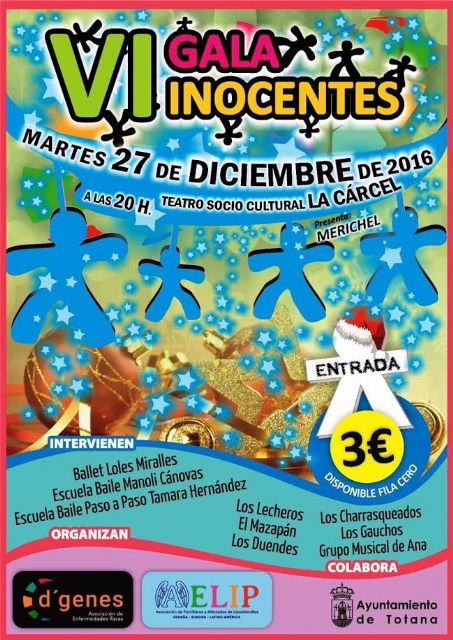 El teatro del Centro Sociocultural "La Cárcel" de Totana acogerá el próximo 27 de diciembre a partir de las 20:00 horas la VI Gala Inocentes, que está organizada por la Asociación de Enfermedades Raras D´Genes y la Asociación de Familiares y Afectados de Lipodistrofias (AELIP), cuenta con la colaboración del Ayuntamiento de este municipio.