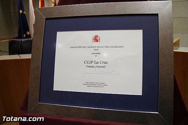 El Ministerio de Educación, Cultura y Deporte ha otorgado recientemente al CEIP "La Cruz" de Totana el distintivo de calidad de centros docentes "Sello de vida saludable", un reconocimiento en el ámbito nacional que se concede a aquellos centros, tanto públicos como privados, que destacan públicamente por el fomento del aprendizaje de la salud en el ámbito educativo.