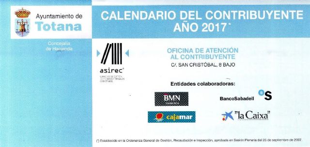 La Concejalía de Hacienda del Ayuntamiento de Totana, a través de la Oficina de Atención al Contribuyente, ha hecho público el calendario del contribuyente para el ejercicio 2017 con el fin de que conozcan las fechas de los diferentes conceptos para este año.
