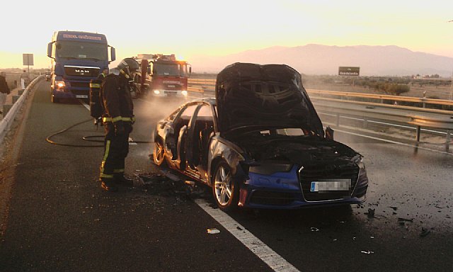 Esta tarde se ha producido un incendio de un vehículo en la A-7 en el término municipal de Totana, donde los bomberos del Consorcio pertenecientes al parque de Alhama-Totana han tenido que actuar para extinguir el incendio así como rescatar a los posibles afectados por el mismo, según informan los bomberos en un comunicado.