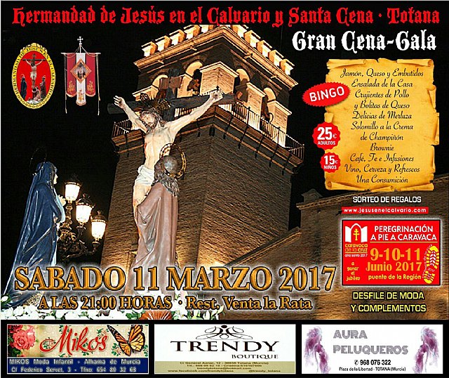 La Hermandad de Jesús en el Calvario y Santa Cena de Totana va a celebrar el próximo sábado 11 de marzo la tradicional cena de convivencia previa a la Semana Santa en el restaurante "Venta La Rata", a partir de las 21:00 horas.