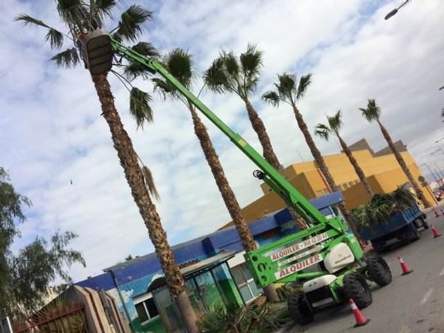 Operarios de la Concejalía de Servicios a la Ciudad e Infraestructuras están procediendo durante estos días a los trabajos de poda y mantenimiento de la población de palmeras en las vías públicas y en los parques y jardines de Totana.