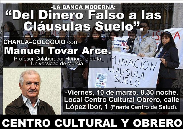 LA BANCA MODERNA: DE LA CREACIÓN DEL DINERO FALSO A LAS CLAUSULAS SUELO. (El título primero, que hemos abreviado por motivo de espacio, era : Los hitos de la banca moderna: "La creación del dinero falso, la manipulación del euribor y las claúsulas suelo". En un primer momento iba a ser en la Sala Gregorio Cebrian, pero nos dijero que era posible que estuviera en obras así que después de tener el cartel esturreado por facebook lo hemos cambiado.