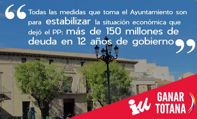 "Exigimos una vez más al PP que den explicaciones y asuman sus responsabilidades, explicando en qué gastaron los millones recaudados por los Convenios Urbanísticos que ahora pagamos por sentencias en firme, las razones por las que no hicieron frente a los préstamos que ellos firmaron, algunos con cláusulas de usura, con un desprecio absoluto a los intereses públicos o la legalidad. Les instamos a que abandonen esa actitud y esa forma de oposición destructiva, ya que ha sido un Alcalde de Ganar Totana IU el que ha hecho frente a la gravísima situación económica y financiera municipal, presentando un Plan de Ajuste real, adoptando medidas para que los vecinos y vecinas de Totana sean afectados en lo mínimo,mientras el PP, responsable de la situación, no aporta ninguna alternativa y se dedica a intentar bloquear la salida a esta situación."