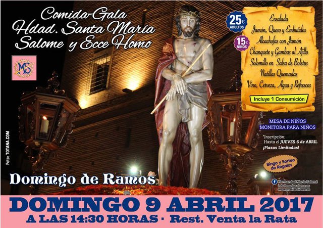 La Hermandad de Santa María Salomé y Ecce Homo organiza una comida-gala que tendrá lugar el próximo Domingo de Ramos a las 14:30 horas en el restaurante Venta La Rata de Totana.