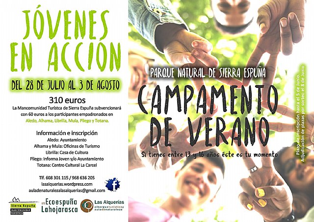 La Concejalía de Juventud del Ayuntamiento de Totana, en colaboración con la Mancomunidad Turística de Sierra Espuña, ha abierto el plazo para participar en los Campamentos de Verano en Sierra Espuña que tendrán lugar en el Aula de Naturaleza "Las Alquerías" este próximo verano.