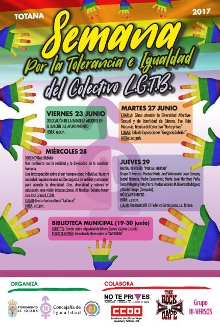 La Concejalía de Igualdad del Ayuntamiento de Totana ha organizado un programa de actividades por la tolerancia e igualdad de Colectivo LGTB, que se celebrará del 23 al 29 de junio, y que cuenta con la colaboración del Colectivo de Lesbianas, Gays, Transexuales y Bisexuales de la Región de Murcia “No te prives”.