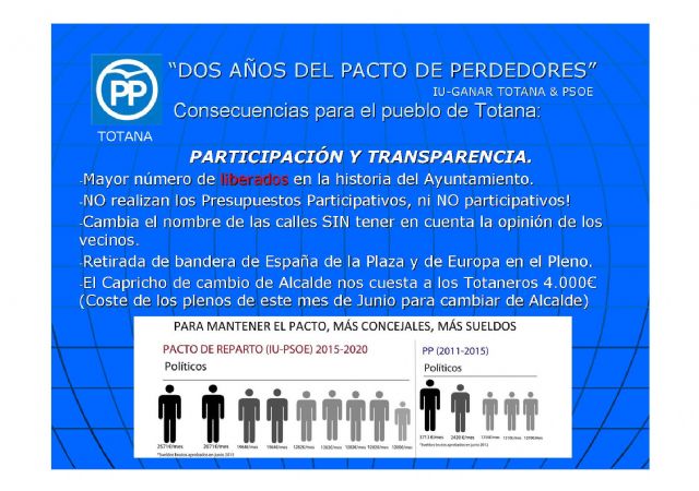 La falta de transparencia en muchas actuciones y la excasa participación ciudadana han hecho que llevaran a cabo el cambio del nombre de las calles sin tener en cuenta las cientos de firmas que los vecinos aportaban para evitar este perjuicio para los vecinos de las calles afectadas, han tomado decisiones sobre el comercio del municipio sin tener en cuenta las demandas de los comerciantes, no han llevado a cabo los presupuestos participativos con los que se le llenaba la boca en campaña y no solo eso, es que no han sido capaces ni de elaborarlos ni aprobarlos, han llevado a cabo la retirada de las banderas institucionales por su propia decisión haciendo oidos sordos a las peticiones de los vecinos y un largo etc, además de intentar manipular y engañar a los vecinos contando cosas que no eran ciertas como el caso de la aprobación por parte de la CARM para construir una piscina en el Hotel de la Santa, mintiendo sobre la deuda real de este Ayuntamiento, encargando a dedo los resultados de una auditoria que pudiese respaldar sus mentiras de campaña y que se ha demostrado que los datos además de habernos costado a los totaneros unos 20.000,00€ solo han servido como tapadera a su mentiras y así un largo etc.