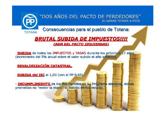 Y por último, otro de los logros conseguidos durante estos dos años ha sido la brutal subida de tasas e impuestos a la que van a someternos a todos los totaneros por los próximos 17 años, con un incremento de 5% anual sobre el valor subido el año anterior, todo ello para justificar su falta de planificación y busqueda de soluciones que no afectasen al bolsillo de los vecinos (la aprobación de un plan de ajuste no implica subida de impuestos).