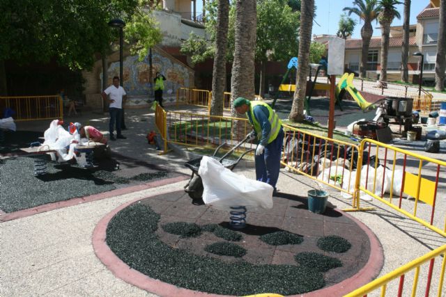Las actuaciones consisten en la colocación de dos centímetros de pavimento continuo para garantizar la seguridad de los usuarios en los distintos juegos, adaptándolos así a la normativa comunitaria.