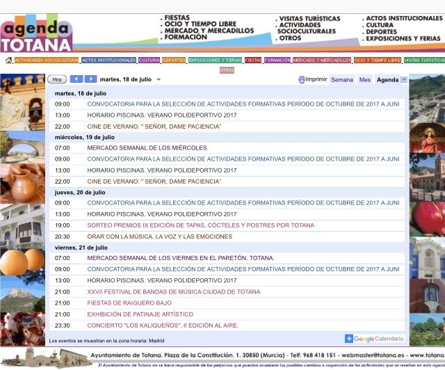 La "Agenda Totana" de la web municipal corporativa www.totana.es es la sección de media más utilizada por los internautas usuarios de esta aplicación, que ofrece información de las principales actividades culturales, de tiempo libre, turísticas y formativas de interés, que se realizan en este municipio.