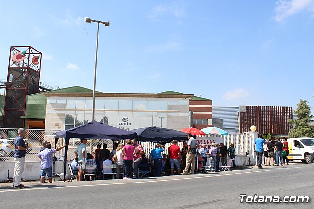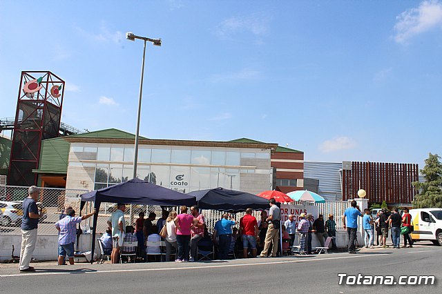 El alcalde de Totana, Andrés García, visitó hoy a los socios cooperativistas que llevan varios días concentrados a las puertas de la Cooperativa Agraria de Totana (COATO) con el fin de solidarizarse con su causa, al tiempo que se ha ofrecido a mediar con éstos y la propia empresa en el conflicto que mantienen para exigir tres millones de euros de las liquidaciones de la campaña de la almendra del año pasado.
