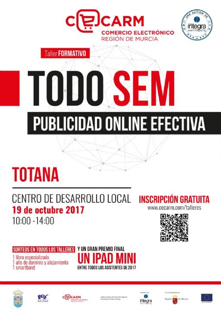 La entidad "Comercio Electrónico Región de Murcia" (CECARM), en colaboración con la Concejalía de Desarrollo Económico del Ayuntamiento de Totana, va a poner en marcha el taller gratuito "Todo SEM. Publicidad Online efectiva", que se celebrará el jueves 19 de octubre en el Centro de Desarrollo Local, a partir de las 10:00 horas.