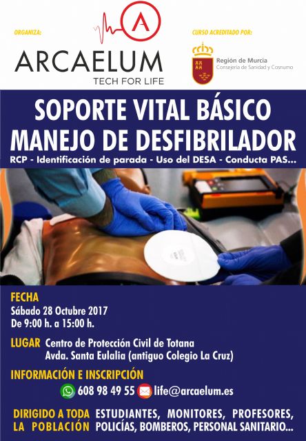 La Concejalía de Desarrollo Económico informa de que el próximo 28 de octubre, el Centro de Protección Civil de Totana (antiguo Colegio "La Cruz"), acogerá el curso de Soporte Vital Básico (SVB) con manejo y uso de desfibriladores semiautomáticos externos (DESA). Dicho curso se impartirá en horario de mañana de 9:00 a 15:00 horas y tiene plazas limitadas.