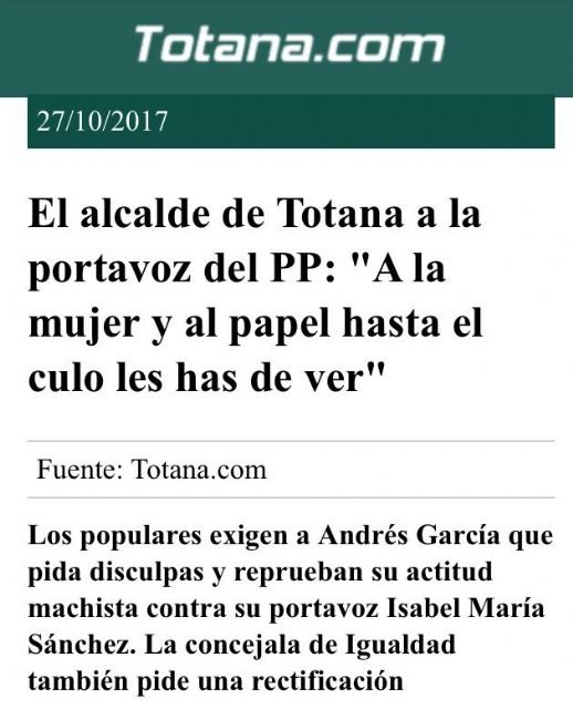 Es muy triste que los medios regionales estén publicando noticias estos días que ponen al Presidente de esta Corporación, que representa a miles de vecinos y vecinas de Totana, como una persona machista que acorraló con un refrán inapropiado a la concejala del PP de forma humillante y tercermundista. Es una mala imagen de nuestra Institución, de nuestro pueblo y Ayuntamiento.