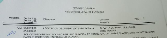 El pasado mes de septiembre, la Asociación de Comerciantes de Totana solicitó al alcalde mediante escrito presentado en registro general del Consistorio totanero mantener una reunión con todos los grupos políticos de la corporación con objeto de tratar el asunto de la instalación de un parque comercial en el Polígono Industrial El Saladar.