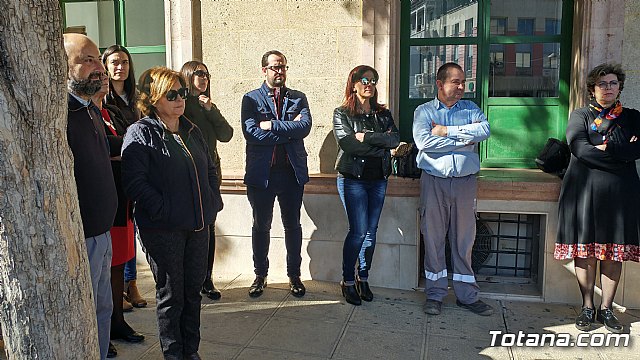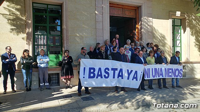 Autoridades municipales, empleados públicos y vecinos de Totana guardaron hoy un minuto de silencio a las puertas del Consistorio totanero como señal de repulsa y condena por el último caso de violencia machista en la localidad alicantina de Elda, en el que una joven de 28 años murió tras ser tiroteada por su expareja, cuando se disponía a recoger a su hijo en el colegio.