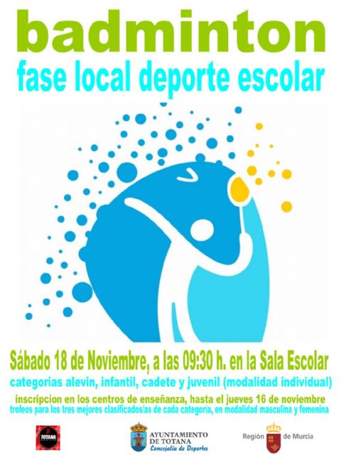 La Concejalía de Deportes, en colaboración con el Club de Bádminton, tiene previsto organizar el próximo sábado 18 de noviembre la Fase Local de Bádminton de Deporte Escolar, a partir de las 9.30 horas de la mañana en la Sala Escolar, dirigida a todos los escolares pertenecientes a las categorías alevín, infantil, cadete y juvenil, tanto en modalidad masculina como femenina.